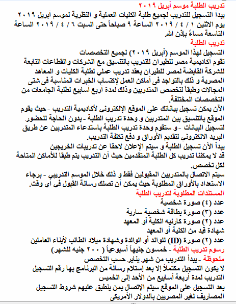 التدريب للطلبة والخريجين، والتسجيل بداية من 1 / 4 / 2019 حتى 6 / 4 / 2019