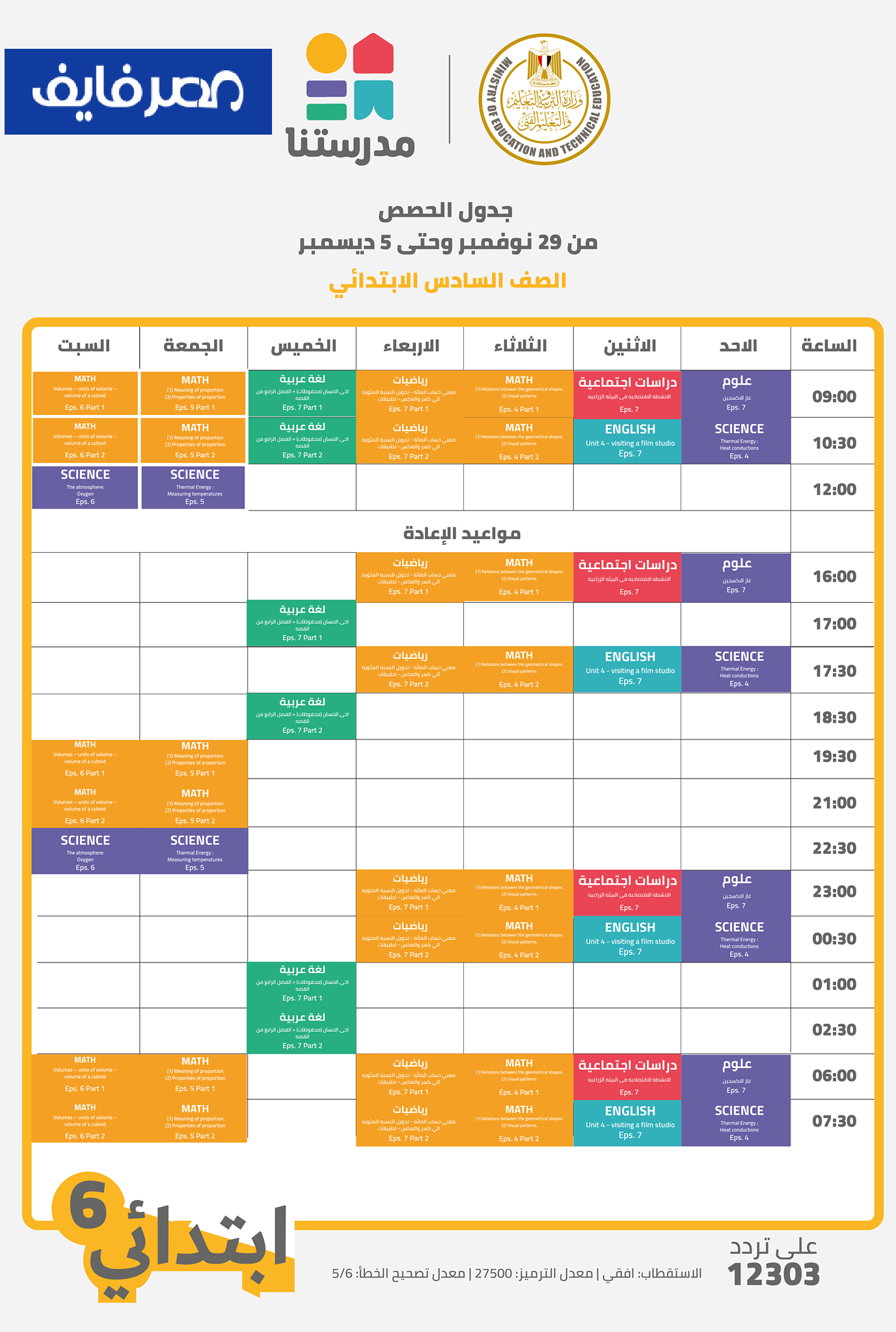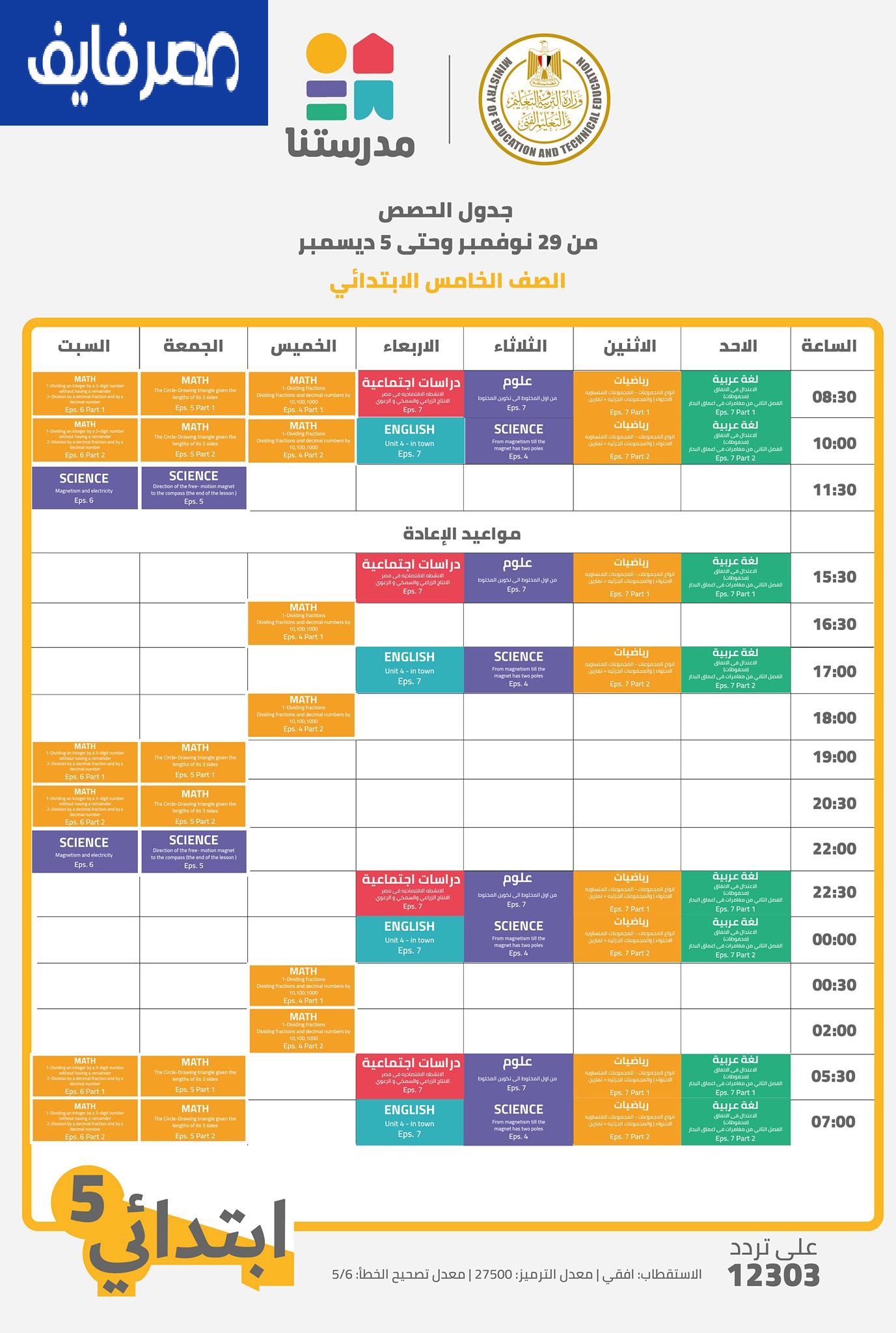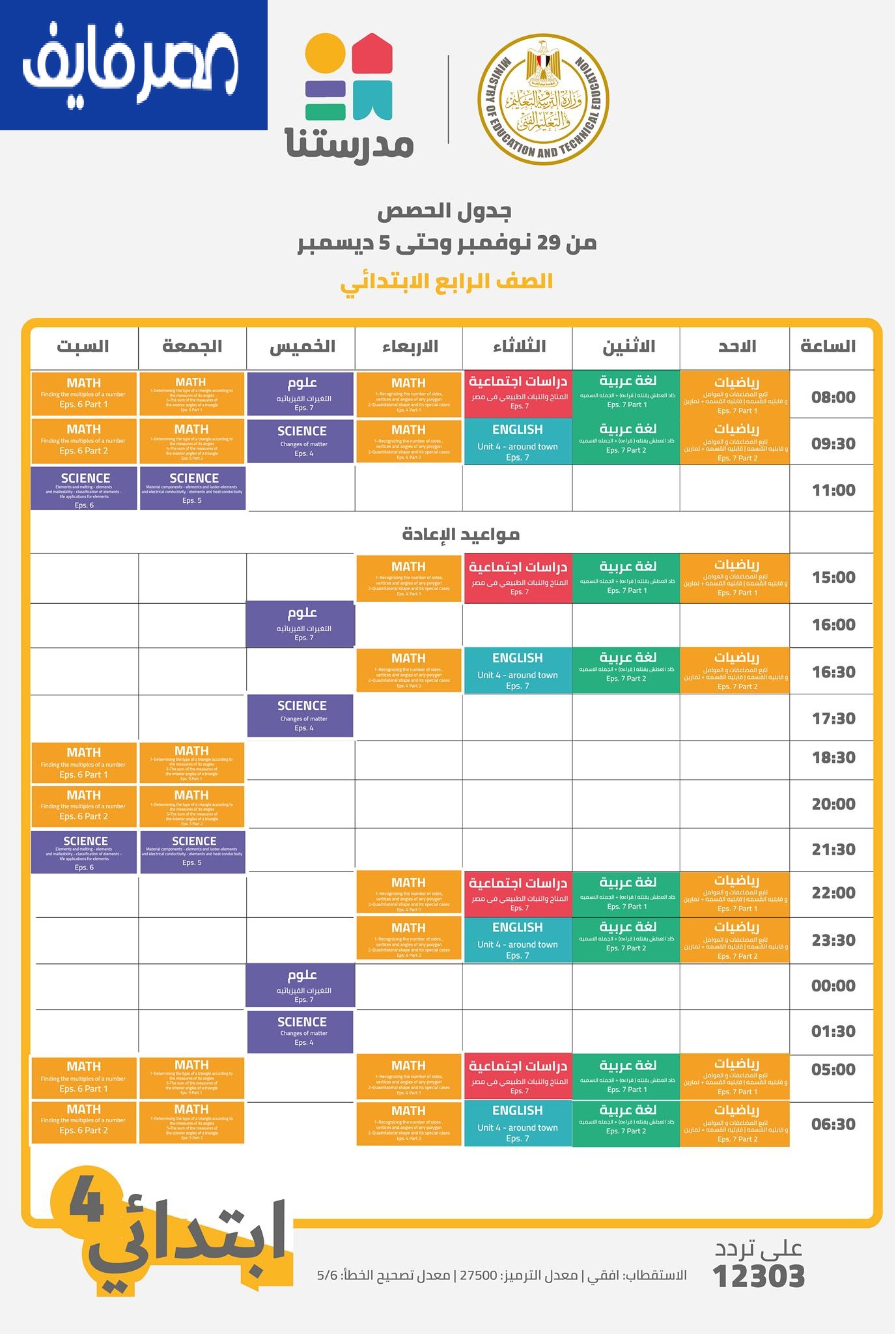 أعلنت وزارة التربية والتعليم والتعليم الفني جدول حصص قناة مدرستنا التعليمية من 12 إلي 18 نوفمبر 2025 لابتدائي وإعدادي من الصف الرابع الابتدائي وحتي الصف الثالث الإعدادي وذلك في إطار سعي الحكومة لتطوير التعليم ليواكب أحدث نظم التعليم عالميا وتوفير بدائل تعليمية متنوعة بعيدا عن المدرسة وتسعي وزارة التربية والتعليم والتعليم الفني في مصر لعمل نظام تعليمي جديد يبتعد عن طريقة التلقين والحفظ والتي يكون اعتماد الطالب فيها علي المعلم والمدرسة لنظام جديد يهدف لتنمية مهارات وقدرات الطلاب عن طريق البحث خلال مصادر تعليمية مختلفة ويكون فيها دور المعلم هو الإرشاد والتوجيه والرد علي اسأله الطلاب علي ما قد تعلموه من القنوات التعليمية والمنصات الإلكترونية التعليمية والكتب الدراسية.