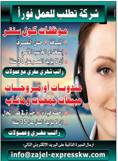 وظائف جريدة الوسيلة الكويت، ومئات الوظائف الشاغرة في عدد كبير من التخصصات المختلفة، وفرص عمل لجميع الجنسيات في دولة الكويت، ووظائف للمهندسين في شركات المقاولات الكويتية، ومطلوب موظفين تسويق عبر الهاتف براتب وعمولة، ومطلوب مندوبين مبيعات وبائعين وكاشير، ووظائف في شركة تسويق لجميع الجنسيات ومن الجنسين.