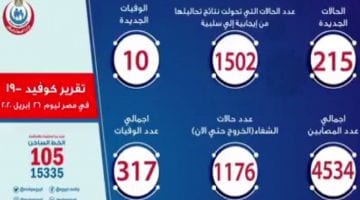 • الصحة تعلن وإرتفاع أعداد المتعافين من كورونا في مصر وتسجيل 215 إصابة جديدة ووفاة 10 حالات