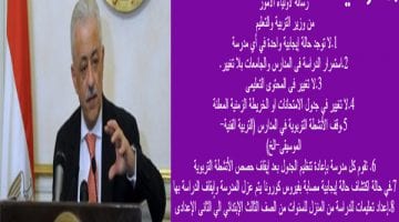 شوقي: عزل المدرسة وايقاف الدراسة للمدرسة التي تعلن اصابة بكورونا وتطبيق نظام “الدراسة من المنزل”